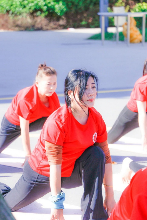 本次活动中有白发苍苍的阿姨、活力四射的小朋友、有刚刚接触瑜伽的新伽人、也有习练多年的瑜伽爱好者。她们身着统一的红色文化衫,脸上贴着鲜艳的五星红旗,阳光映衬着伽人们的脸庞,显得格外耀眼。