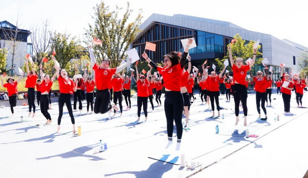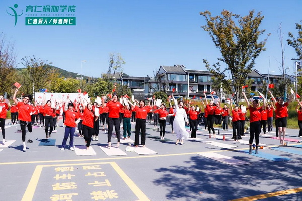 10月2日上午8点,100多位伽人齐聚南京汤山温泉康养小镇广场,用健身瑜伽马拉松挑战赛的方式,庆祝新中国成立75周年!初秋的南京略有些寒意,却无法阻挡伽人们的热情。随着清晨的第一缕阳光洒满小镇,一张张瑜伽垫铺开在广场中央,如同在祖国的广袤大地上展开一幅绚丽画卷,而她们早已做好准备迎接108遍的健身瑜伽马拉松挑战了!